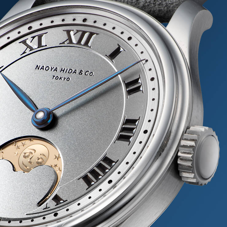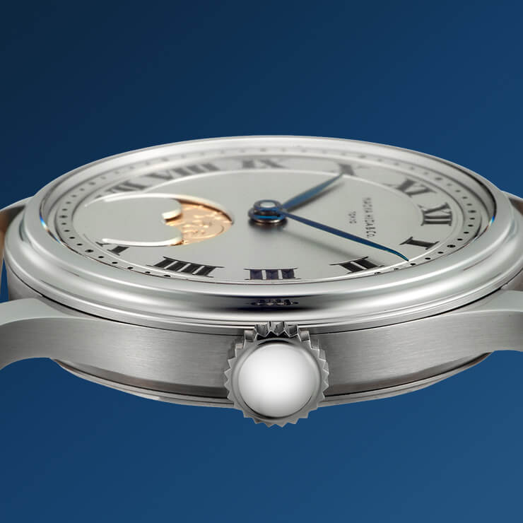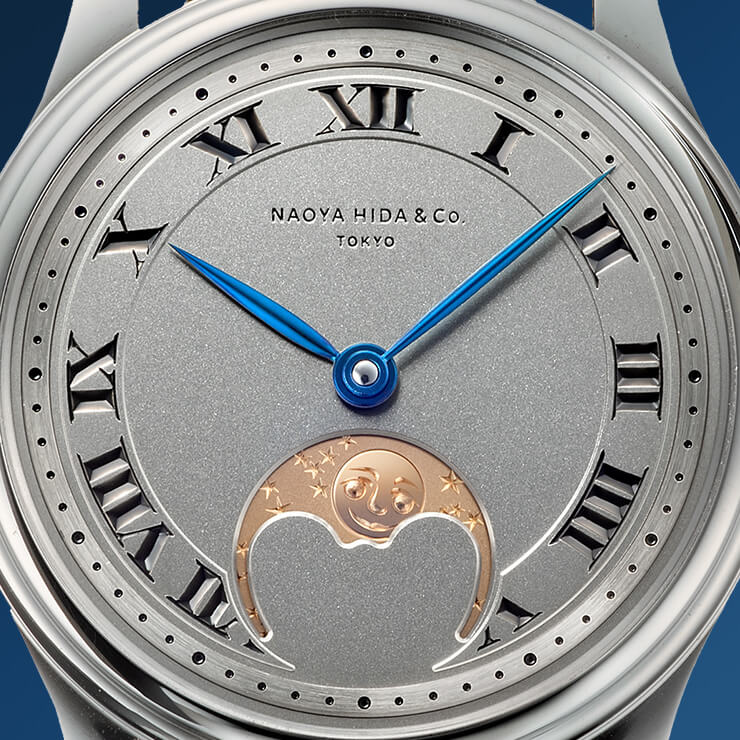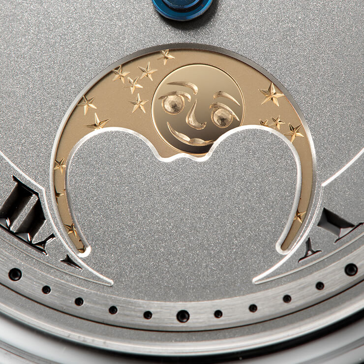- ムーンフェイズ・ディスクは18KYG製、ビーズブラスト処理を施した後星を手彫り、月は別部品で製作され顔を手彫りした後、ムーンフェイズ・ディスクに固定